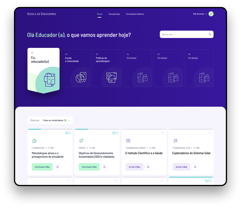 A Escola de Educadores é um Ambiente Virtual de Aprendizagem que oferece ferramentas digitais para que educadores e instituições de ensino desenvolvam e compartilhem conteúdos, fortalecendo uma comunidade viva de troca de saberes e experiências.